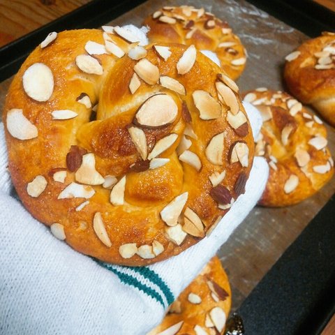달달한 시럽을 한번씩 끼얹어주고 아몬드를 토핑해서 구웠어요! 프레즐은 역시 뜨거울 때 먹어야 맛있어요ㅎㅎ!