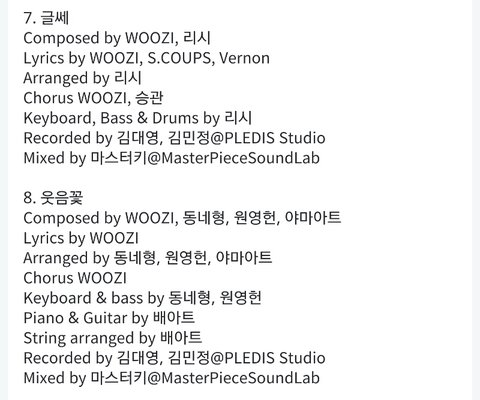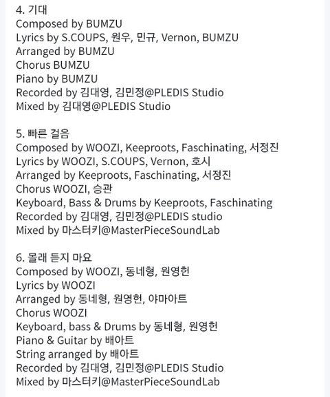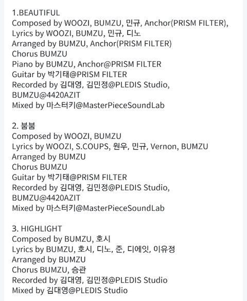 타이틀곡 붐붐을 포함해 총 8곡이 수록되어있는 이번 앨범은 자체제작아이돌 세븐틴답게 또 작사작곡에 많은 멤버들이 참여했는데요