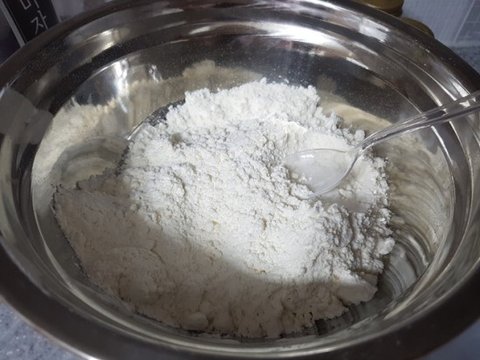 먼저 박력분과 베이킹파우더, 소금을 계량해 채쳐두었어요!