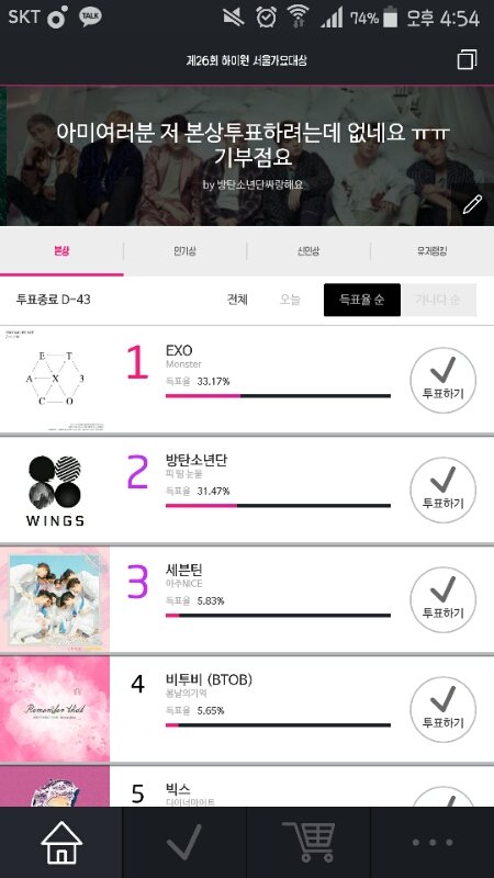 스밍도 잘 하고 있겠지만 석아대 투표했어? 차이가 얼마안나서 넘나 걱정이야 쇼케이스라서 기분이 두근두근되겠지만 스밍이랑 투표 꼭하자..❤