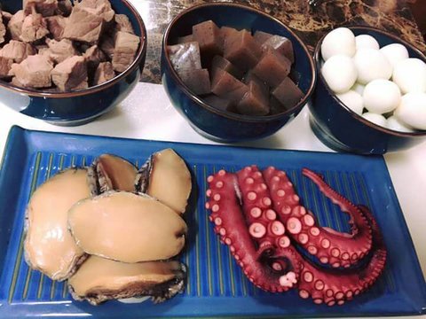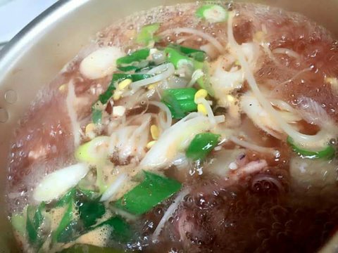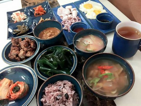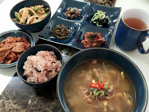 콩나물국, 콘샐러드, 해물소고기장조림(전복, 문어, 곤약, 소고기, 메추리알),