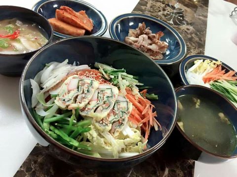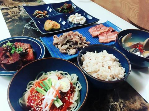비빔국수, 대패삽겹, 물김치, 소고기미역국
