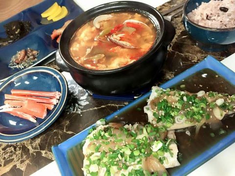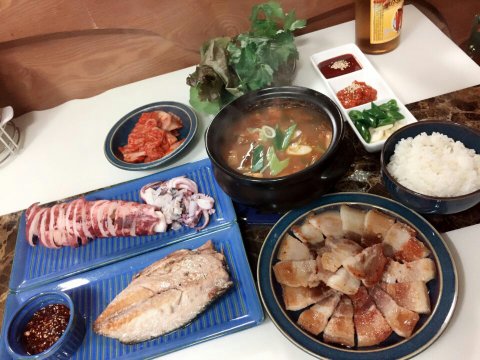 해물순두부찌개, 데리야끼삼치구이, 전날 먹다남은 홍게다리..