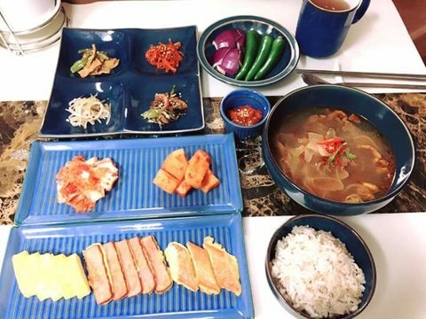 달걀치즈전, 소고기, 해물된장찌개, 오이무침