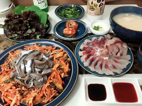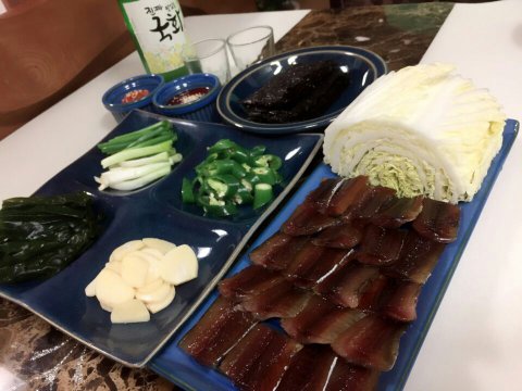 다시마쌈, 기장시장에서 산 개상어회1만원치에서 절반, 대패삼겹, 겉절이, 물김치 그 외