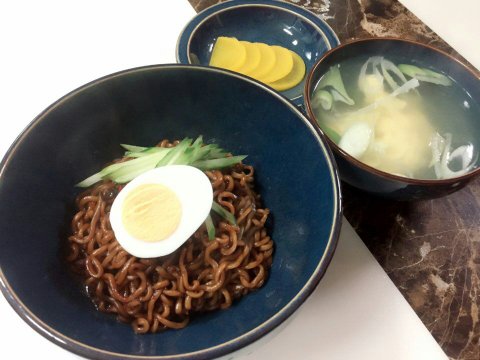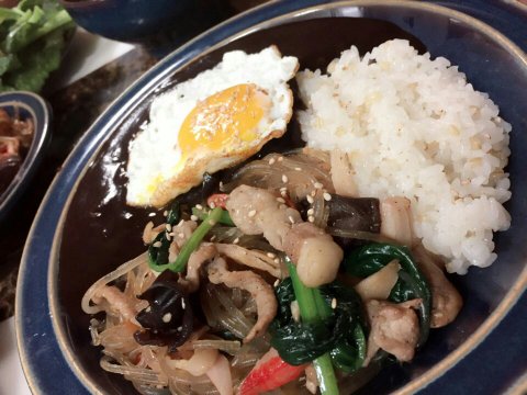 잡채가 잇길래 짜장소스 얹고 달걀후라이해서 중국집 볶음밥 흉내내기!