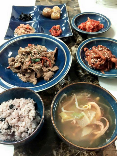 돼지불고기, 오징어콩나물국, 오징어볶음, 알감자조림 외 밑반찬