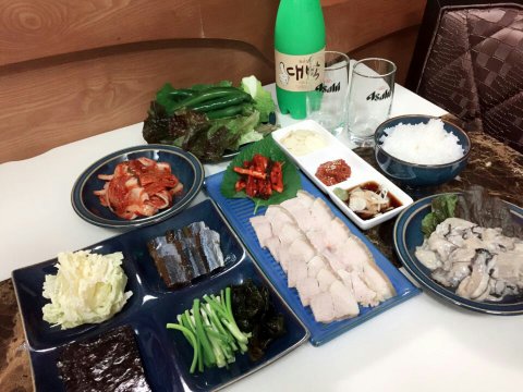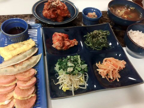 오징어콩나물국, 다시마쌈, 대패삼겹, 달걀후라이, 호래기데침 외 감자볶음 등 밑반찬