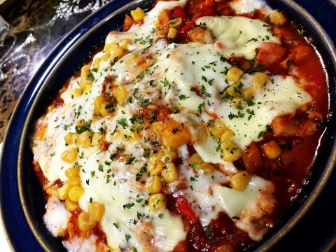 포테이토, 베이컨, 햄 깔고 파프리카, 양파, 콘, 토마토소스, 치츠, 파슬리가루!