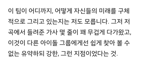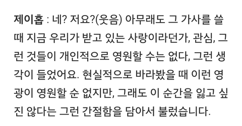 일단 5월 에필콘 가신 기자분이 쓰신건데 이건 기사화 되지 않은 내용이야!! 기자분이왜 너희는 아이돌의 끝을 인정하려해? (언제까지 내꺼일수는 없어 큰 박수갈채가 라는 영포에버 가사 듣고 물어보신듯) 이런 식으로 물어본것에 대한 대답...
