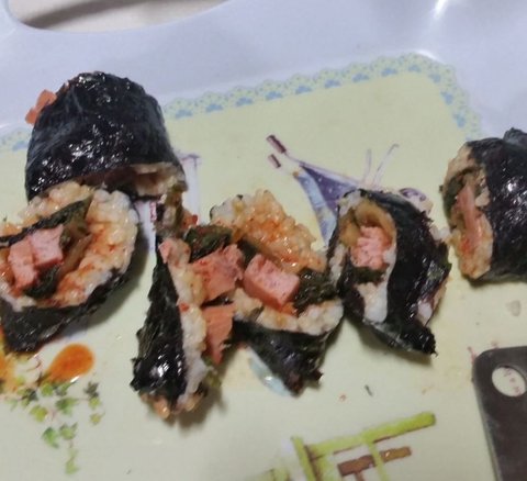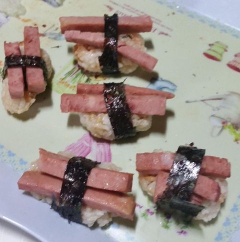 이것은 나름 창의적으로 김밥을 만들고 남은 재료로 다르게 만들어본 햄 초밥입니다.