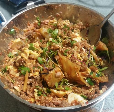 밥 안에 김치도 들어가 있구요. 맛있습니다. 근데 만들고 나니 손이 굉장히 더러워졌었습니다.