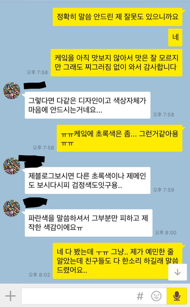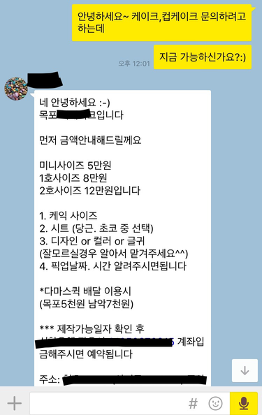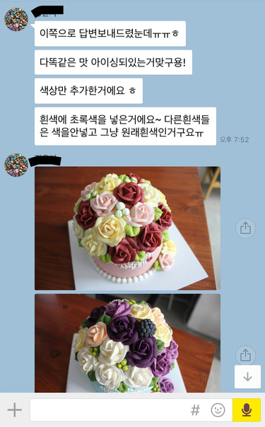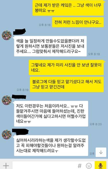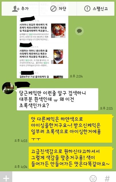 여기서 좀 기분이 나쁘고 어이가 없었어요... 아니 누가 이런 청테이프 같은 케잌 나올줄 알앗냐구요.. 예쁜 케잌 나올줄 알앗지... 이런 몬생긴 케이크는 블로그에 존재하지도 않구요!!!!!! 3년동안 이런 사람이 처음이라면서 저를 유난 취급하고.. 제 친구들 다 못생겼다고 했는데요.. 저랑 기싸움하는 느낌도 들구요. 하얀색으로만 제작해달라고도 하시구요;; 이렇게 말씀하시는 데 정말 어이가 없더라구요. 진짜 할 말이 없어서 ..... 뭐라하지 이러고 있는데 답장이 없으니 그쪽에서 갑자기 이모티콘 쓰시면서 저렇게 하시는데 뭔가 태세변환? 같이 느껴져서 더 별로였습니다.