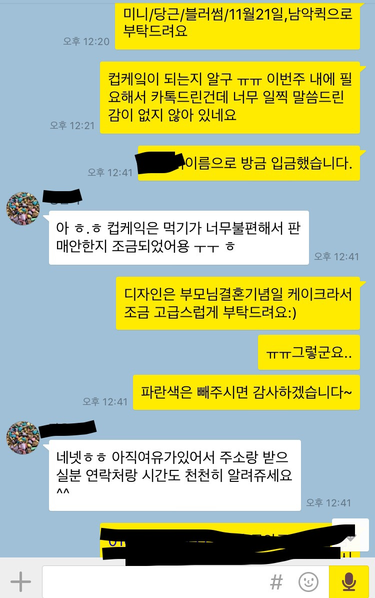 일어나서 판매자한테 톡을 보냈는데 (제 폰이 상태가 안좋아 다른 폰으로 보냄) 답장이 없으셔서 잊었거든요(ㅎㅎ;;) 어차피 케잌은 밤에 하니깐..!