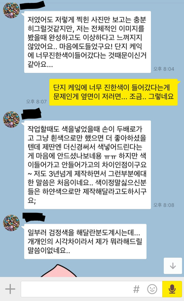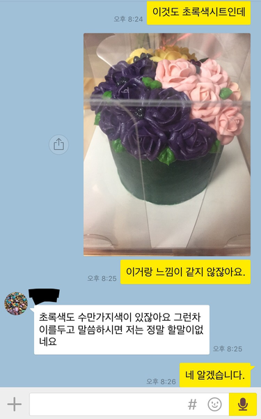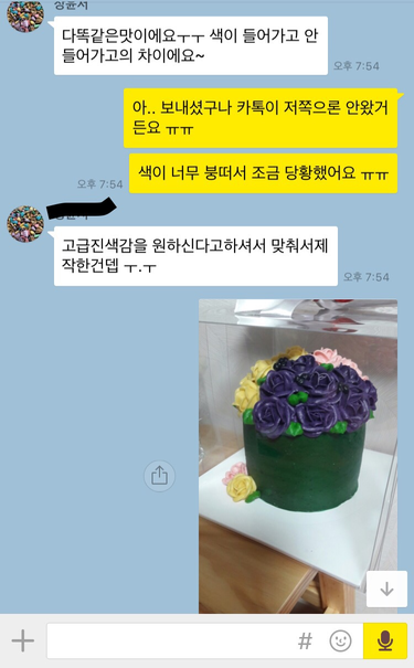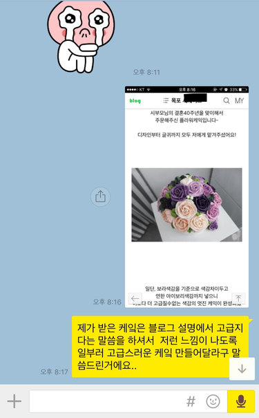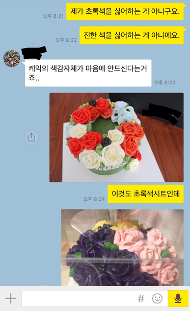 근데 고급스런 느낌을 떠나서 그냥 케잌이 못!생!겼!다!고요. 환불해 달라고 톡한 것도 아니고 진짜 이 케잌을 예쁘다고 생각하시는 건지 또 이런 상황에서 대처를 어떻게 해주실건지 보는 거였는데...