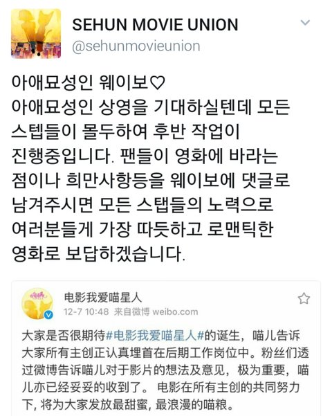 한한령땜에 걱정하는 팬들 많았는데... (물론 팬들보다 어그로님들 아주 말 많으셨지!!) 묘성인 웨이보에 이런 스윗한글이 올라왔네 내년에 만나요~~ 량치교수 보고싶어~~