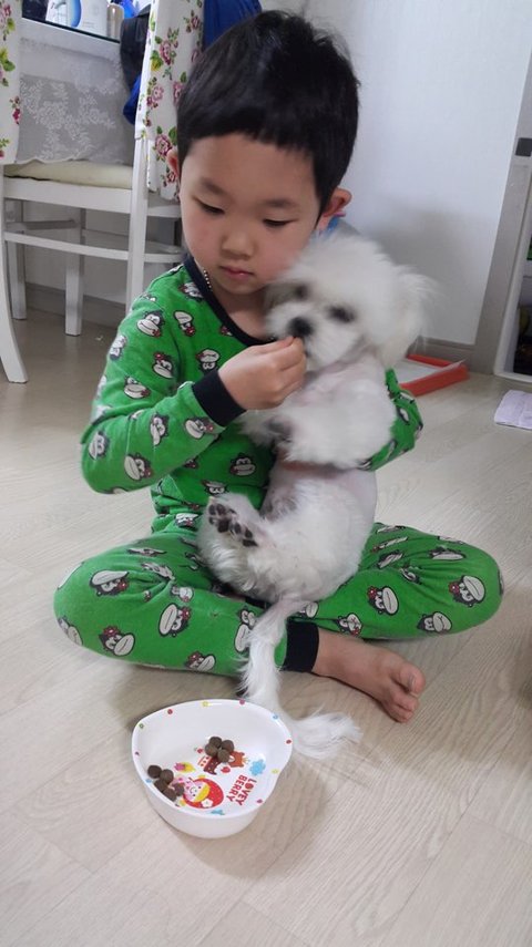 꼬미 사료를 바꿧는데 안먹어서 저희아들이 하나하나 먹여주니 먹네요^^