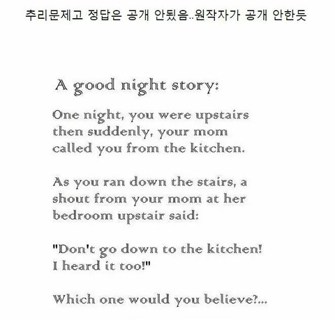 1층이 위험인물인 경우를 상상해 보자. 1층이 위험인물이라면 자고 있는 사람들을 깨울 필요 없이 그냥 조용히 올라가서 처리를 하면된다. 하지만 1층은 큰 소리로 위험을 알렸으며 [아이의 이름도 알고 있었다.] 또한 자기의 위치(아래층 부엌)로 오라고 하지 않고 위험지역을 피하라고만 하고 있다. 아이의 상태가 2층이니 위층은 위험하니 내려와 라는 회피명령에 계단을 사용해서 부엌으로 갈 수도 있지만 다른 곳 현관, 거실, 집밖으로 나갈 수도 있으며, 그냥 창문을 통해서 뛰쳐나가는 것도 가능하다. 자신이 있는 지역으로 유인하는 것이 아니라 단순히 위험을 회피할 것을 권고하고 있는 것이다. 따라서 1층이 위험인물일 가능성은 그렇게 크지 않다. 다만 1층의 인물이 아이의 이름까지 사전에 조사를 한대다가 랙터박사 급 위험인물이라서 말한마디 가지고도 자기가 있는 곳으로 유인을 할 수 있는 사람이라면...(빅 픽쳐..) 심각하게 위험해 질 수 있다. ======================================================== 2층이 위험인물인 경우를 상상해 보자. 2층의 인물은 1층에서 큰 소리가 나고 더욱이 2층에서 아이가 꽤나 움직이고 난 다음에 이야기를 한다. "○○야! 엄마도 방금 그걸 들었어! 내려가지 말거라!" 라고 한다. 2층의 인물이 위험인물일 경우 1. 자기가 먼저 소리를 내지 말아야 한다. 2. 도망을 가려는 사람을 자기가 있는 곳에 잡아두어야 한다. 2층의 인물은 이 둘을 모두 만족시키고 있으며, (또한 1층의 인물이 먼저 아이의 이름을 불렀기 때문에 이 점도 위험인물일 경우에도 쉽게 이름을 부를 수 있게 되는 것이다.) 따라서 2층의 인물이 위험인물일 가능성은 보다 높다고 할 수 있다.