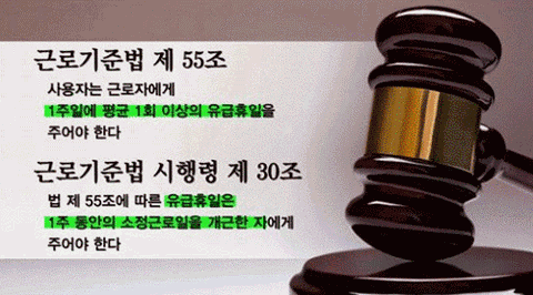 <근로기준법 제 55조> 사용자는 근로자에게 1주일에 평균 1회 이상의 유급휴일을 주어야 한다. 라고 돼있는데 주휴수당은 법임! 법은 지키라고 있는 것임