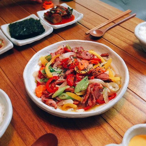 오리훈제볶음이예요. 어쩜 이렇게 알록달록 예쁘게 만들어주시는지.