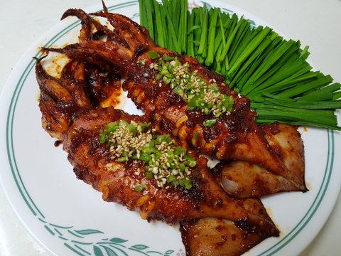 불징어는요. 오징어를 살짝 데치고 후라이팬에 기름 두번정도 친 후 오징어 올리고 양념을 골고루 발라줘요. 양념은 (고추장1.고춧가루2.다진마늘1.후추조금.올리고당1.간장1) 앞뒤로 굽고 노릇하게 익으면 잘라서 먹으면 되요! 오징어는 오래 익힐수록 질기다는 소리가.. 팁은 콩나물,부추와 함께먹으면 더 맛있다는점!