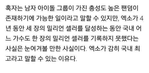 엑소 매년 나오는 성적에 비해 과소평가 받고 있어서 슴 스탭들도 맘 안좋다고 그러더라 스탭들이 그런데 당사자들은 오죽할까 애들 악플도 다 읽어보는거 같던데 진짜 양심적으로 악플은 안달았음 싶다... 그 나이에 엄청난 스케줄 소화하면서 제대로 쉬지도 못하고 달리고 있는데 좋은 말만 해줘도 부족한 시간에 악플이라니 뒤에서 피나는 노력하면서 그 자리에 올랐을 애들 생각하면 그 정도 사랑 받을 자격은 있는데 욕먹는거 거의 대역죄인급이여서 당사자도 뭣도 아닌 내가 봐도 가슴아픔 그런데 그런 글을 당사자가 보고 부모가 본다고 생각하면 끔찍하다 진짜