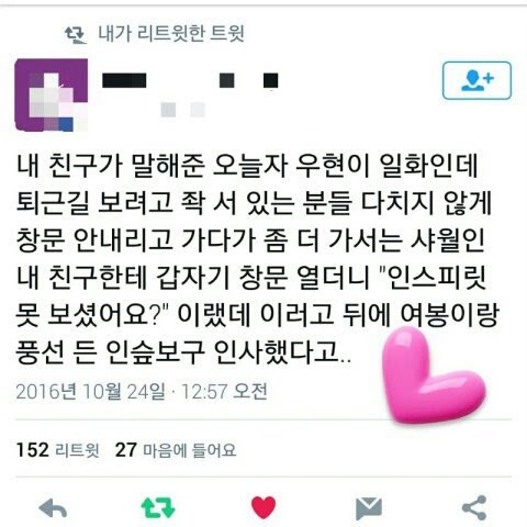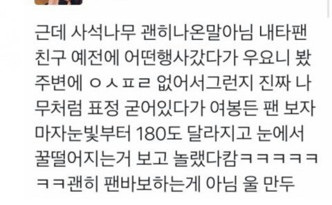 허억 넘 인스피릿이랑 인피니트 관계가 너무 설레ㅜㅜㅜㅜㅜㅜㅜㅜㅜㅜㅜㅜㅜㅜ 저번에 원아시아 우리 애들 보러 갔는데 누군가가 자기 팬 챙긴다고 걱정하는 게 너무 설렜어... 원아시아 길 잃어버렸을 때 어쩌다가 아이돌 비밀 통로? 를 봤는데 성규 님이 위에 보면서 손 흔들어줬어 넘 멋있는 것... 성종 님이랑 손도 만지니 정말 인스피릿 할까봐... 글이 너무 길어졌다 인스피릿 인피니트 사랑해요 흥해라...