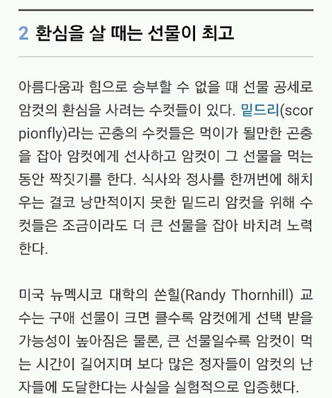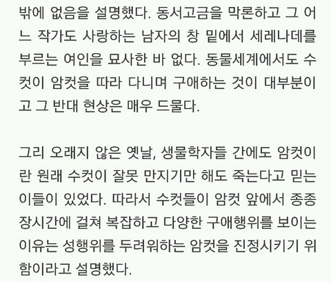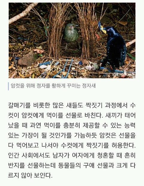 수컷이 암컷한테 잘보이려고 노래하고 먹이를 주는건 대부분의 종들한테 해당된다.