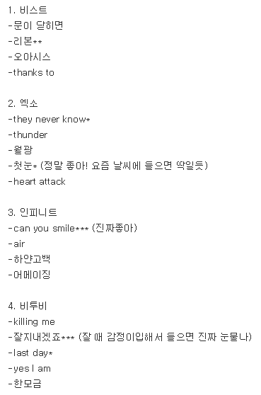 +) 이게 뭐라고 톡선까지...ㅎㅎ 댓글로 추천해 준 노래들도 다 들어볼게ㅎ 댓글 읽다 보니 빼먹은 곡이 많다...엑소 my lady랑 아이콘 저스트고도 진짜 좋아!+) 미안해...방탄소년단은 미처 생각을 못했다 ㅠㅠ수록곡은 잘 몰라도 타이틀은 되게 좋아해! 추천해 준 곡들 들어볼게+) 어쩌다 보니 한 두개씩 유명한 곡들도 들어갔네...ㅎㅎ미안