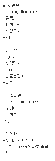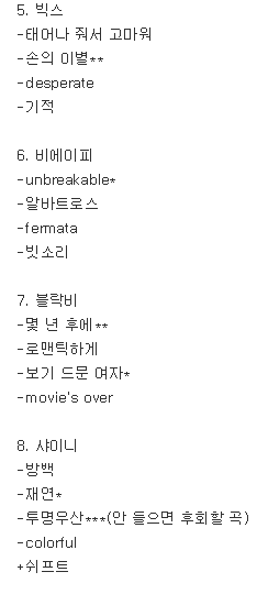 발매된지 좀 된 노래가 있는데 내가 막 어린 건 아니라서ㅋㅋㅎㅎ적다 보니까 빠진 게 되게 많은 듯하다...혹시 나중에라도 생각나면 추가할게!