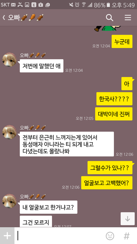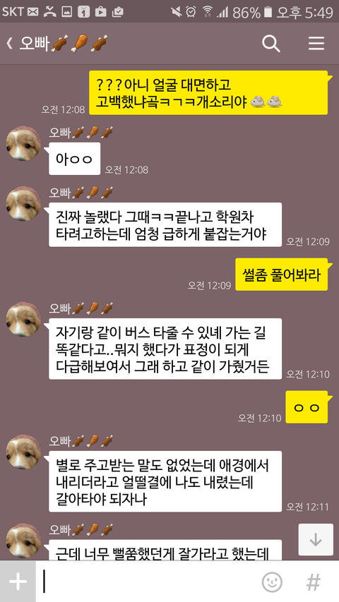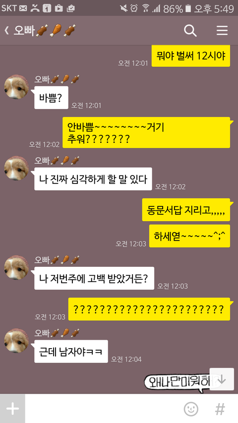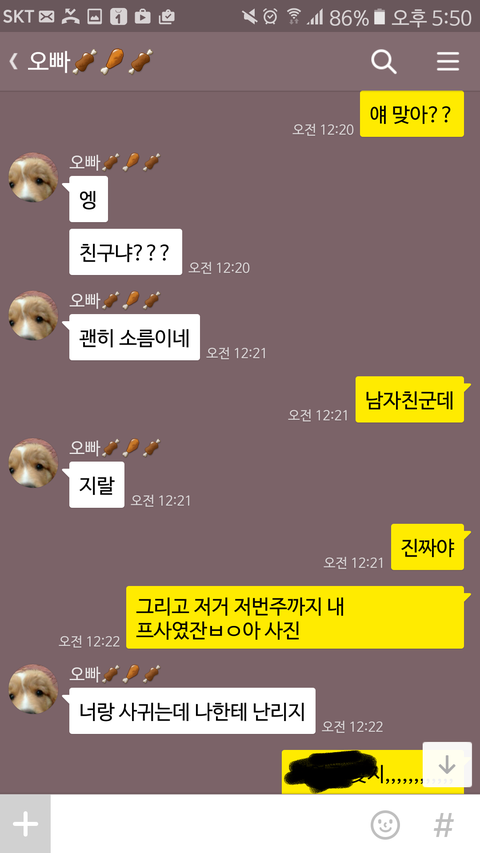 그런데 하루는 오빠가 나보고 이랬음.그날이 스터디 종료날이였는데,같이 공부하던애중에 계속 붙어있어서 좀 친해진애가 있는데 걔가 "이제 형이랑 같이 못있는다고 생각하니까 너무 아쉬워요"이랬다고,무슨 의미인것같냐고 진짜 심각한 표정으로 물어보는거임.그때는 그 사람이 남친일거라는 상상도 못했었고,그냥 단순히 상황이 너무 웃겨서 오빠 무슨 생각하냐고 의미부여하지 말라고 웃고 넘겼는데,지금 생각해보면 좀 많이 묘하고..여튼 남친이랑 오빠랑 계속 연락했었던것 같음.그리고 남친이 오빠한테 고백했다는 사실을 알게된건 불과 어저께임ㅋㅋ전남친이 되것도 아니고 여전히 사귀고 있을때..........학원에서 예비고3들 정신교육시킨다는 개념으로 천마산으로 작게 2박3일로 수련회를 갔음.나는 아무 생각없던 차에 오빠한테 카톡이 온거임.한평생 선톡은 없었던 사람이 왠일이지 싶어서 바로 확인함.