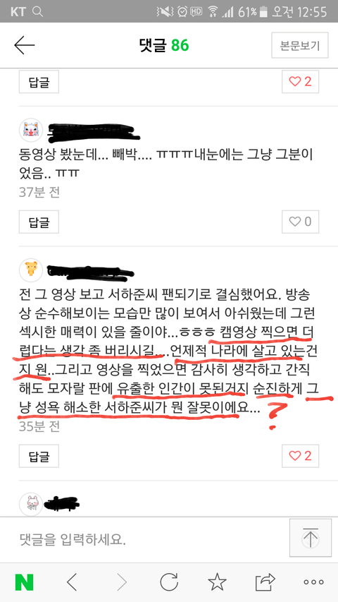 아래 사진들은 초록사이트에 올라온 서ㅎㅈ이 몸캠 루머 당했다는 식의 블로그 글 댓글들임
