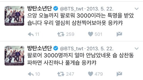 방탄 데뷔초에 팔로워 3000얼마안남은걸로 엄청좋아하고 막 감사하다고 올렸는데 지금은