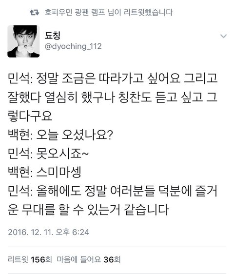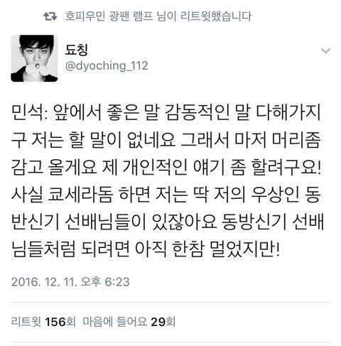 항상 열심히하는 민석이니까 언젠가 반드시 동방선배님같은 최고의 가수로 인정받게 될꺼라 믿어!!