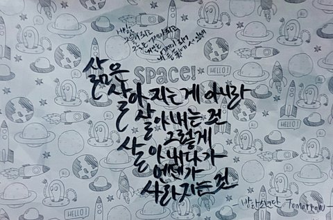 그냥 취미로 캘리 배우는 중이거든ㅠ 독학으로 두달정도 됐어! 좀 미숙하지만 애들 가사 몇개 적을수 있는데 애들가사 좋은거좀 적어주라!