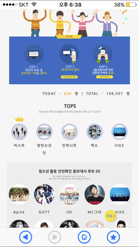 하루에 한번밖에 못하지만 그만큼 투표가 진짜 간단하거든 다들 한번씩만 하자~~~바쁘고 요즘 투표도 많디만잊지말구