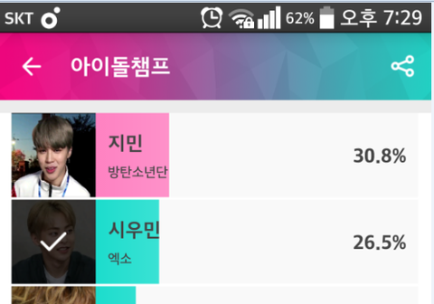 아이돌챔프에서 하는 투표!! 상 주는 건 아니지만 우리 민석이가 2위라니... 21일까지 매일 한번씩 할 수 있는 건가봐 난 동생 치킨 사주고 하루에 한번씩 투표해주기로 했어 ㅋㅋㅋ