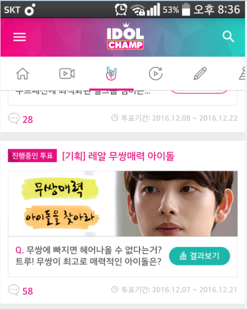 댓글보고 혹시나 해서 이 짤도 덧붙여 저기 피스 손모양 아이콘보이지? 거기 누르고 들어가면 투표글 보임 하루에 한번! 무료 투표야