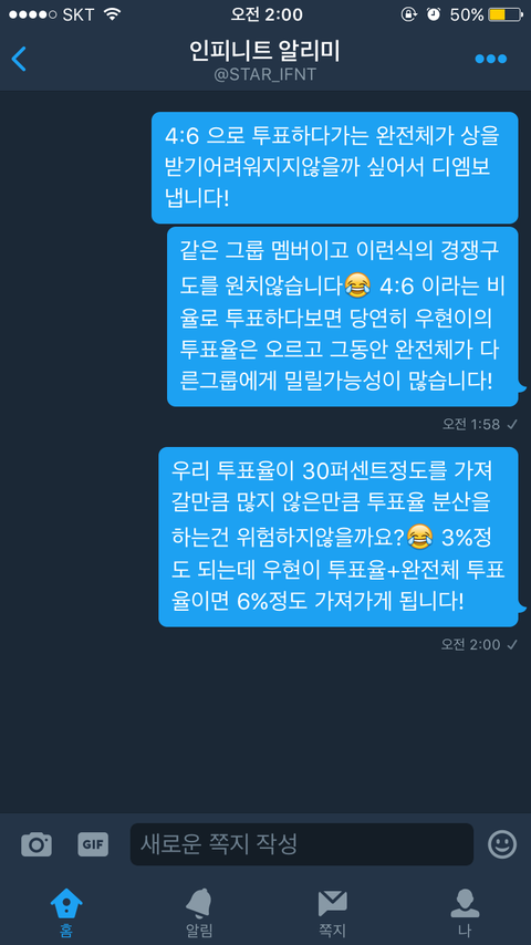 아까 디엠 보냈다는 쓰니는아니구 아무래도 불안해서 나도 다엠 드려봤어! 저 4:6 글이 리트윗이많이되서 다들저랗게 투표하는것같아서 얘기해드렸는데 어떻게썼는지 모르겠다ㅠㅠ