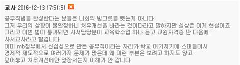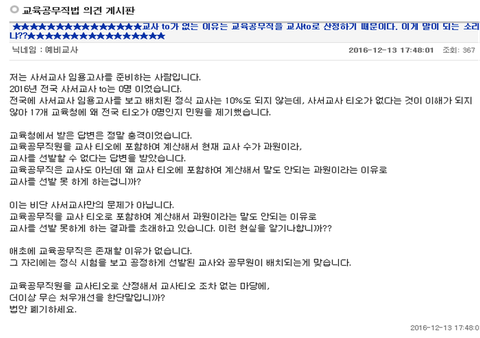 공교육의 질은 전문성 있고, 진실된 교사로부터 나옵니다. 진정 대한민국 앞날의 교육의 발전과 공교육의 효율성을 높이기 위한 방안이 무엇인지 진지하게 숙고해 보시길 부탁드립니다. 이와 같은 ‘역차별적인’ 문제로 인해 수많은 공무원 준비생과 교원 임용 준비생, 그리고 막 돋아나는 싹을 피우려는 어린 학생들의 꿈을 저버리게 하지 마세요.