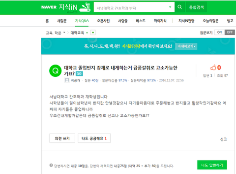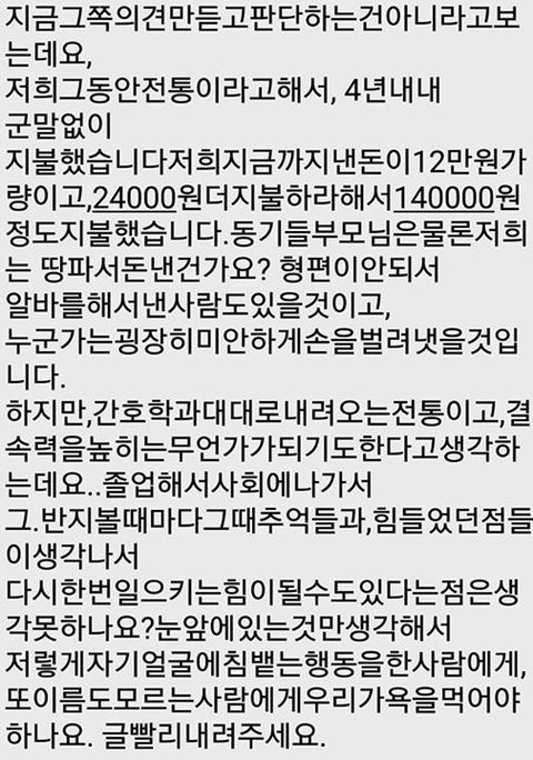 이게 이슈화되면 서남대학교 간호학과 얼굴에 먹칠하는거고 누워서침뱉기라거나 취업에 문제생긴다는말이 선배들한테 이미 나오고있습니다 그렇게 취업에 문제생길정도의 비상식적인 일이라면 끝내는게 맞는데도 그렇지않고있어요