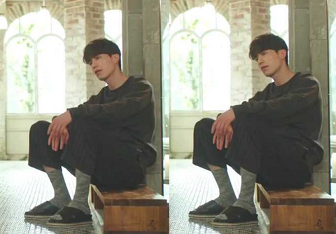 블랙블랙한 패션에 렉켄 슬리퍼 신고 앉아 있는데