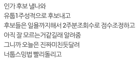 가온 디종 16윈가 그랬어 나온지 10일 된 노래가ㅋㅋㅋ 다음 주부턴 ㅂㅂ 나와서 1위하기 힘든 거 알잖아.. 지금 플디 피드백도 중요하지만 더 중요한 건 애들 공중파 1위 시켜주는 거야. 잠시 동안만 안 좋은 일들은 다 잊고 1위 시켜주는 데에 집중하자 초동 8만 팔고 공중파 못 먹었는데 초동 13만 팔고도 또 못 먹고 싶지 않지?