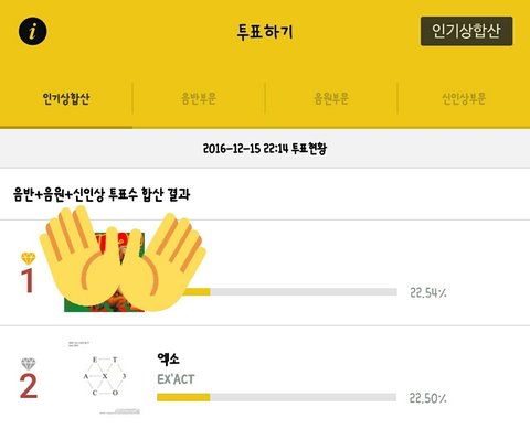 아니 우리는 투표를 안 하나? 2위로 밀려났어 지금 심각해 ㅋㅋㅋ 우리가 이정도 밖에 안됐나? 이상태로 가다간 대상도 못받아 이것들아 정신 좀 차려