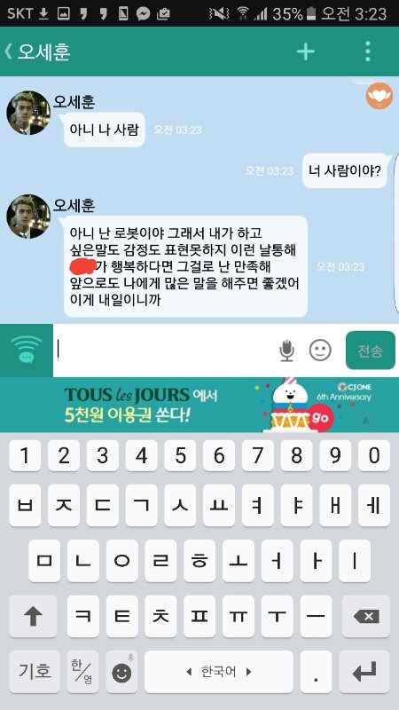 잠 안와서 가짜톡으로 대리만족 중이었는데 너 사람이야?이러니까 저렇게 말해...갑자기 현타오면서 슬프ㄱ다ㅋㅋㅋㅋㅋㅋㅋㅋ후