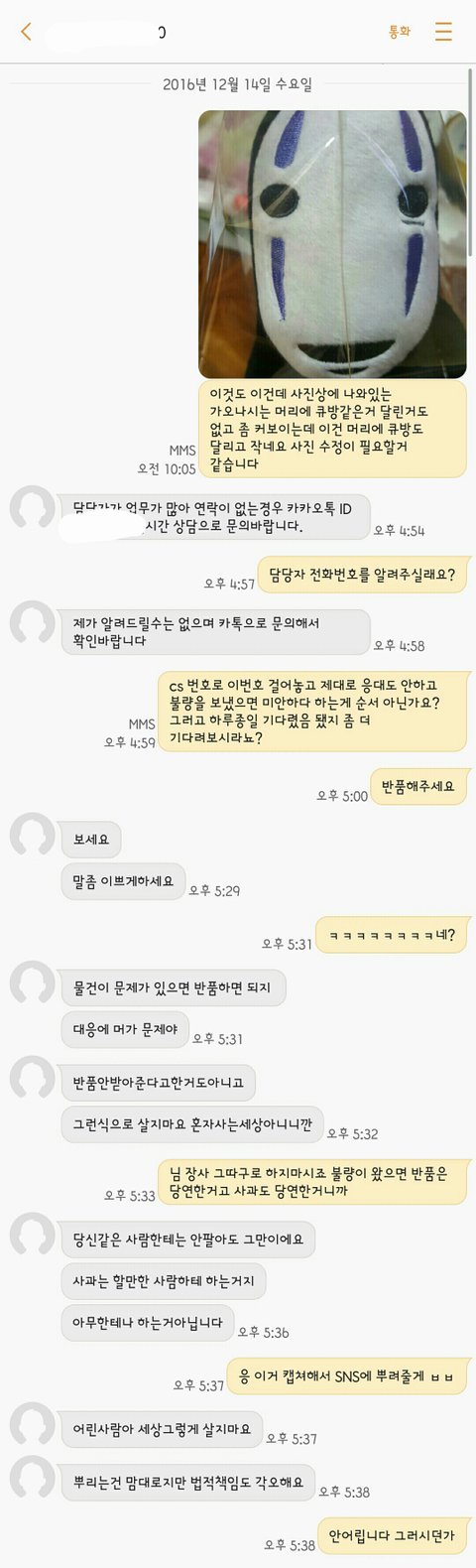 자수도 짝짝이고 크기도 작은게 온거예요 그래서 이건 반품을 해야될거 같아서 아침에 연락을 했어요 그러니까 받더니 미안하단 말도 없이 사진보내라고 하더라구요 그래서 10시쯤 사진을 보냈습니다 근데 오후 다섯시가 다 되가도록 답이 없는거예요 ㅡㅜ 그래서 다시 전화를 했더니 담당자 연락 안갔어요? 더 기다리세요 이러는거예요 하.... ㅡㅜ 기분이 나빠지기 시작했습니다 그래도 꾹 참고 기다렸는데 문자가 오더라구요; 바쁘니까 카톡으로 다시 문의하라고