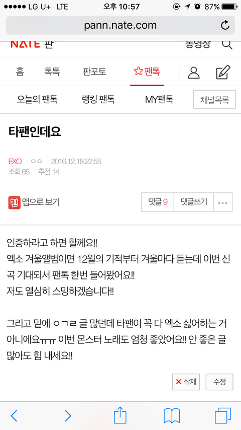 제 가수 활동기도 아니고 같이 스밍히고 싶은데 스밍 하는 방법 댓글에 남겨줄 수 있을까요?? 자꾸 남의 팬톡 들어와서 글 올려서 죄송해요ㅜㅠ 근데 진짜 엑소 겨울앨범 다 좋아해서 그래요ㅠㅠ 12시에 스밍인증샷 올릴께요ㅠㅠ