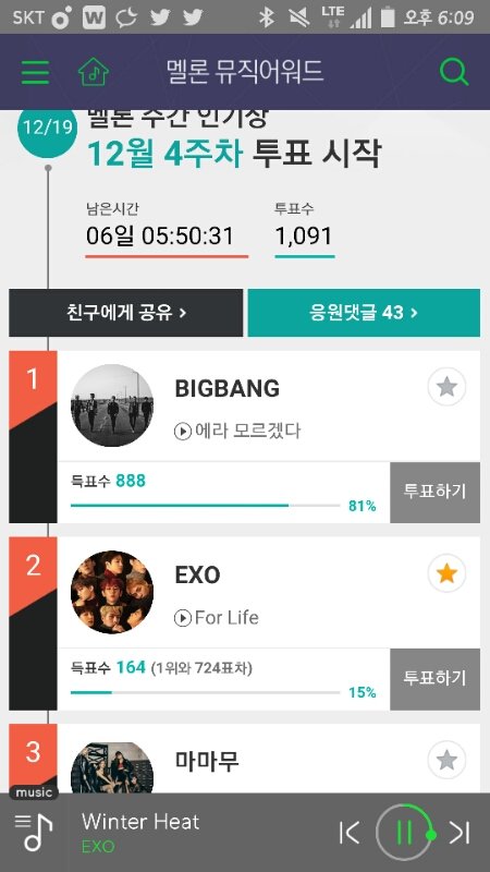 멜1론들어가서 뮤1직어워드 > 주간인기상 투표해