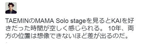 「TAEMIN의 MAMA Solo stage을 보면 KAI을 좋아했던 시간이 공허하게 느껴진다. 10년후 양쪽 위치는 상상할 수 없을 정도로 차이가 나게 될 것이다.」