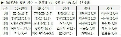 갤럽 조사 보면 엑소는 10~30 대 그들은
